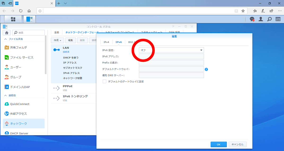 ネットでいろいろ調べてみた結果、NECのルーターとSynologyのNASの間で相性問題がある模様。我が家もバッチリその組み合わせでした。NASのIPv6が有効になっていると不具合があるようなので、設定を探してIPv6を無効に。これで見事、ネットワークの復旧に成功できたのでした。